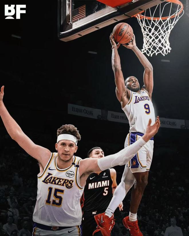 而且最重要的不光是这个小阵容,布朗尼还完成了他非常精彩的进球,就算只有一个球也够了,当时我们看得很清楚,反击当中,里夫斯运球布朗尼急速跟进,湖人这是一次快攻,所以热火队的防守已经来不及了。此时里夫斯吸引了所有人防守之后把球高高抛起,布朗尼从左侧切入,双手接球完成了一次滑翔空接暴扣,他起跳高度极高,已经直接平框了。